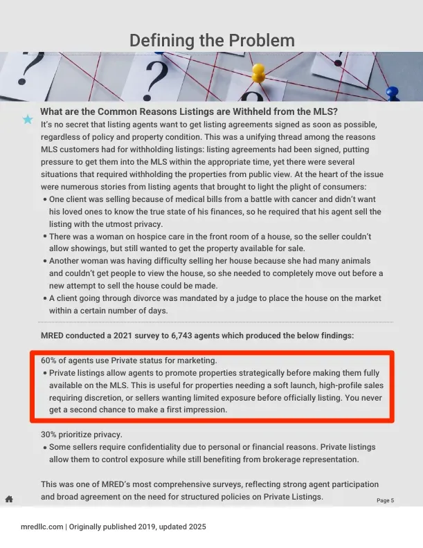 MRED’s Private Listings accommodate pre-market “Coming Soon” listings as well as listings that would otherwise be kept off the MLS.