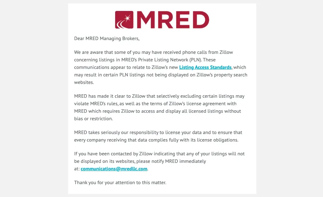 The conflict between Zillow and MRED is escalating. Earlier this year, MRED sent this email out to its brokers:
